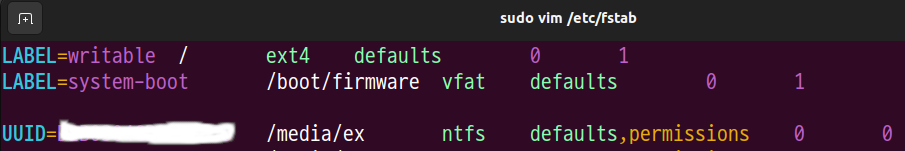 이에 대한 외장 메모리 연결 구성은 아래와 같다. ( /etc/fstab 파일 )